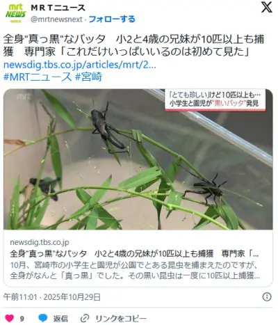 幼い兄妹が公園で「全身真っ黒なバッタ」を10匹以上捕獲 専門家も驚く ゴルゴム…