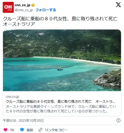 80歳女性、豪華客船で豪州一周60日間の旅 → 2日目に無人島に置き去りにされ死亡