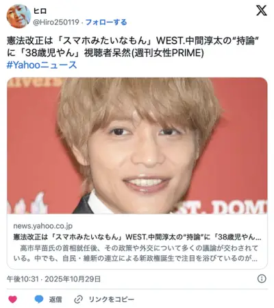 【芸能】憲法改正は「スマホをアップデートするみたいなもん」 WEST.中間淳太の持論に視聴者呆然「38歳にもなって…」