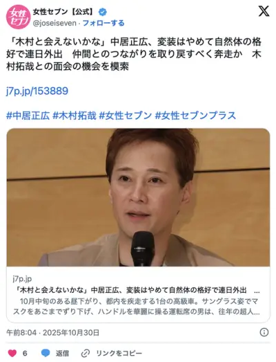 「木村と会えないかな」中居正広、変装はやめ自然体の格好で連日外出 仲間とのつながりを取り戻すべく奔走か 木村拓哉との面会の機会を模索