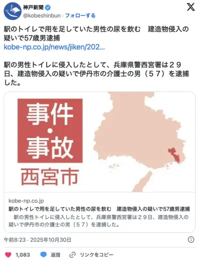 【兵庫】駅のトイレで用を足していた男性の尿を手ですくって飲む 建造物侵入の疑いで57歳男逮捕