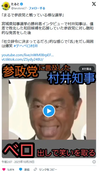 【(´ڡ`)】「さすがに舐めてる」宮城・村井知事 参政・神谷代表に“ノーサイド宣言”直後に舌をペロり…煽り仕草に批判続出