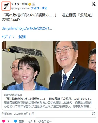 連立離脱の公明党、「高市政権が終われば復縁も……」