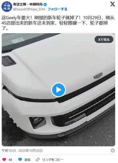 中国の新車、ディーラーから納車された直後に前輪の足回りまるごと外れる