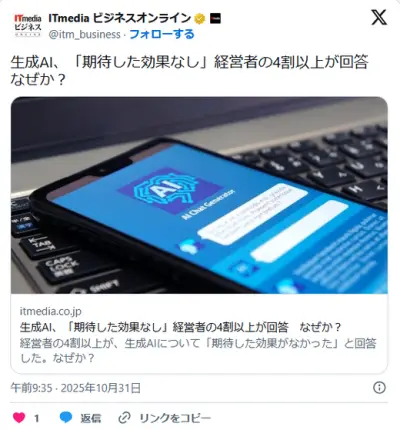 【生成AI】「期待した効果なし」経営者の4割以上が回答… 「活用方法が分からない」「AI人材の不足」がトップ