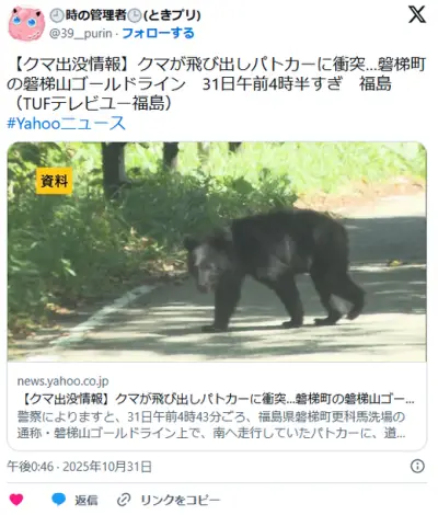 【クマ出没情報】クマが飛び出しパトカーに衝突…磐梯町の磐梯山ゴールドライン 31日午前4時半すぎ 福島