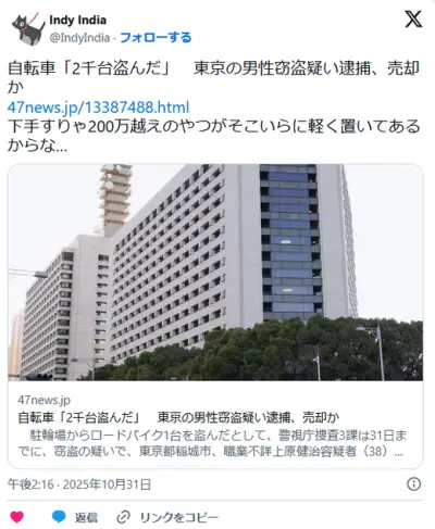 自転車「2千台盗んだ」 東京の男性窃盗疑い逮捕、売却か