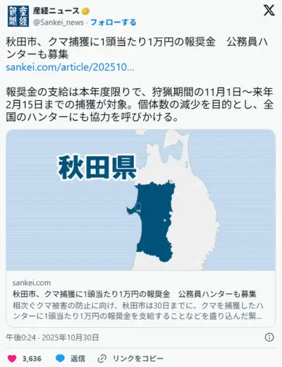 秋田市、クマ捕獲に報奨金 公務員ハンターも募集 報酬も現行の4千円から8千円に倍増