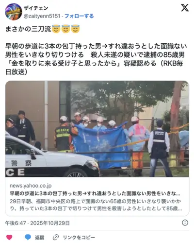 オレオレ詐欺に騙されたフリして現れた受け子を3本の包丁で切りつけた老人逮捕。でも別人でした。