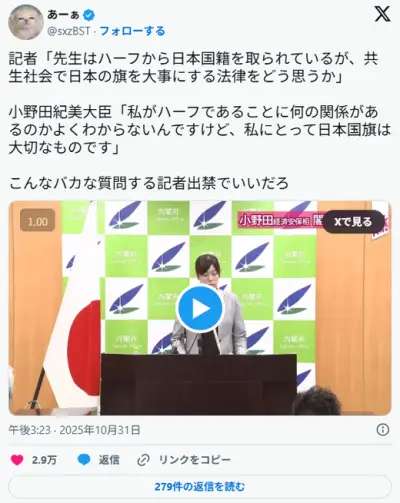 記者「小野田大臣はハーフから日本国籍取られているが共生社会で日本の旗を大事にする法律をどう思うか