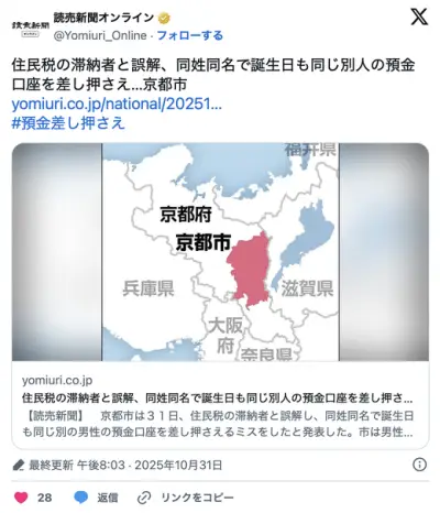 住民税の滞納者と誤解、同姓同名で誕生日も同じ別人の預金口座を差し押さえ…京都市