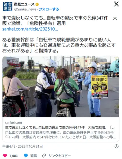 「自転車の違反で車の免停」急増…警察「自転車で安全意識が低い人は車でも事故を起こす恐れがある」