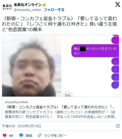 「コンカフェ従業員に色恋営業された!払った15000円を返金しないと通報する!」男性客(48歳)の言い分「愛してるって言われたのに…」