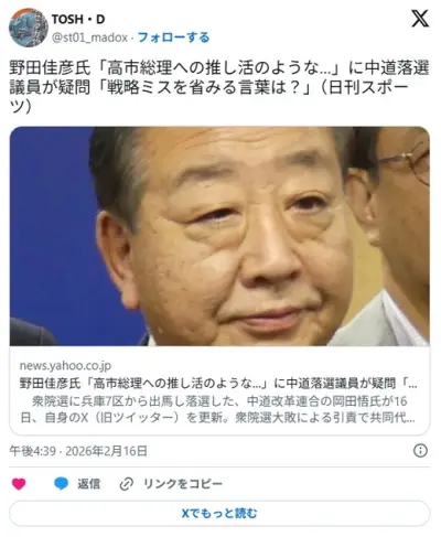 中革連・野田氏「高市総理への期待感だけの『推し活』のようなイメージ論に選挙戦全体が支配された」