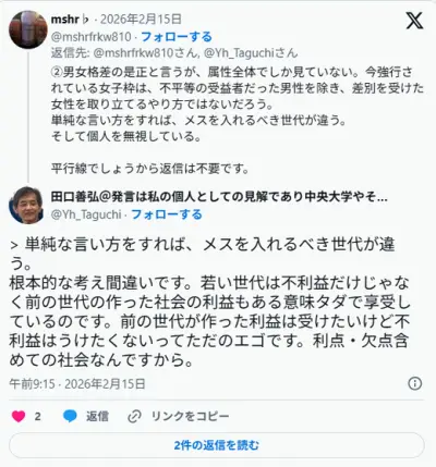 中央大教授「女子枠に反対する若い男子学生はただのエゴ。彼らには不利益を受ける責任がある」