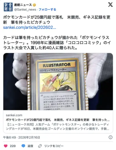 ピカチュウのポケモンカード25億円超で落札 米競売、ギネス記録更新