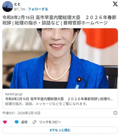 【春節】高市早苗総理大臣 2026年春節祝辞