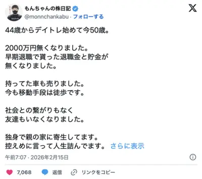 ツイッタラX「44歳からデイトレ始めて今50歳。早期退職で貰った退職金と貯金2000万円が無くなりました。何の為に生きてるんだろう」