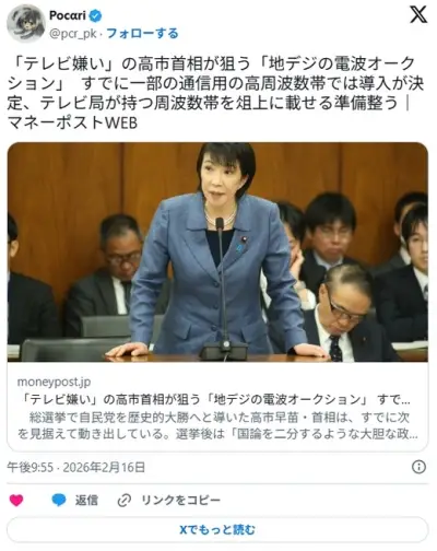 高市総理『国会で大多数を占めた今こそ、私の悲願であることを成し遂げたい。 停波 です。』