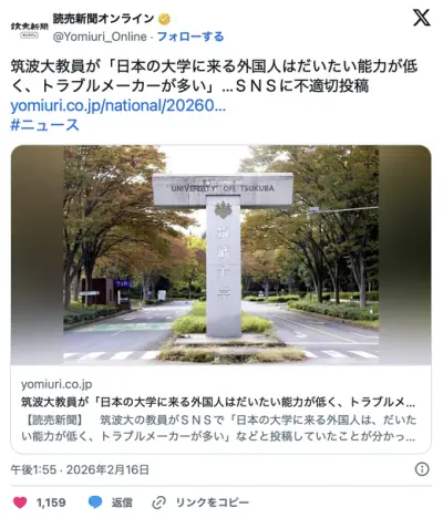 筑波大学のネトウヨ馬鹿教員『日本の大学に来る外国人はだいたい能力が低く、トラブルメーカーが多い』