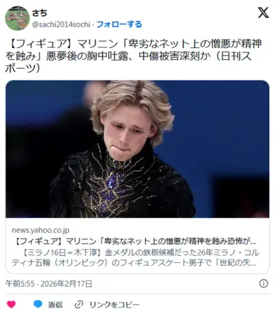 【五輪】フィギュア男子 金メダル候補のマリニン惨敗… 「卑劣なネット上の憎悪が精神を蝕み恐怖が闇へと誘う」 悲劇後の胸中吐露