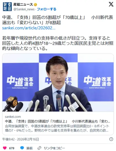 中道、「支持」回答の5割超が「70歳以上」 小川新代表選出も「変わらない」が8割超 (産経・FNN合同世論調査)