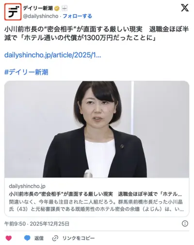 【ラブホ】小川晶前前橋市長の“密会相手”が直面する厳しい現実 退職金ほぼ半減で「ホテル通いの代償が1300万円だったことに」