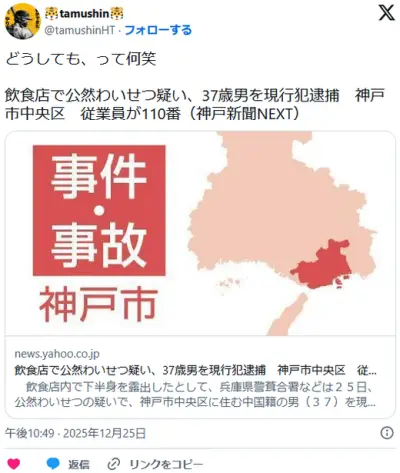 中国人の37歳男、飲食店で下半身を露出した容疑で現行犯逮捕 「どうしても出したかった」と供述