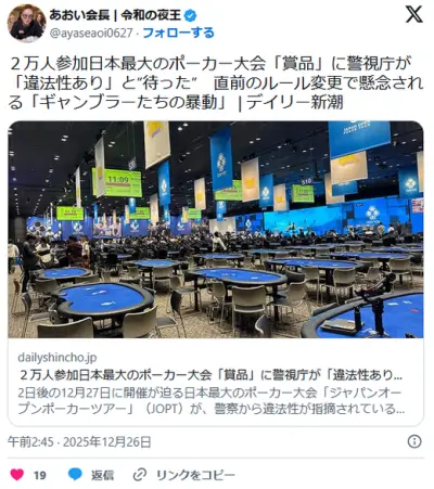 2万人参加の日本最大のポーカー大会、警察から違法認定され賞品無しに パチンコとの扱いの差に暴動懸念
