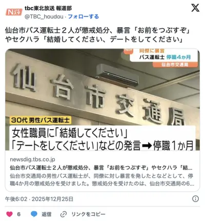 「結婚してください、デートをしてください」セクハラで仙台市バス運転士懲戒処分