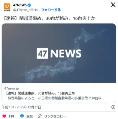 【群馬】関越道事故、30台が絡み、16台炎上か