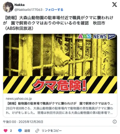 【(・(ェ)・)】動物園の駐車場で職員がクマに襲われけが 園で飼育のクマはおりの中にいるのを確認 秋田市