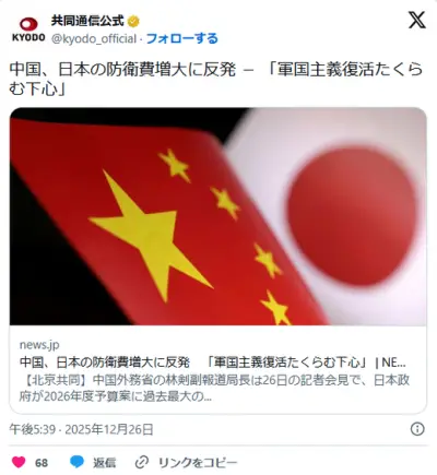 中国外務省、過去最大の日本の防衛費に反発「軍国主義復活をたくらむ邪悪な下心をさらけ出した」