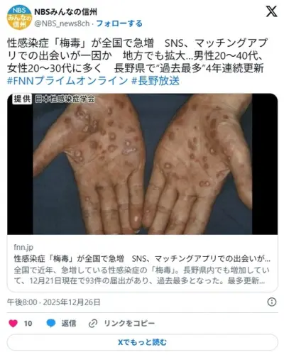 梅毒急増 マッチングアプリでの出会いが一因か 男20~40代、女20~30代 長野で過去最多