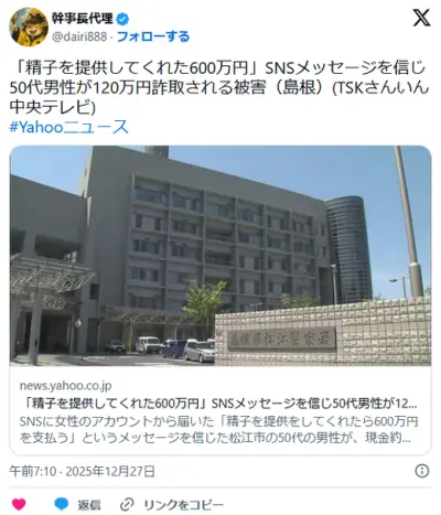 【島根】「精子を提供してくれた600万円」SNSメッセージを信じ50代男性が120万円詐取される被害
