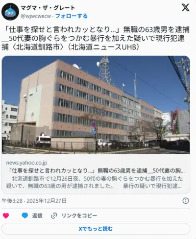 「仕事を探せと言われカッとなり…」無職の63歳男を逮捕_50代妻の胸ぐらをつかむ暴行を加えた疑いで現行犯逮捕 釧路市