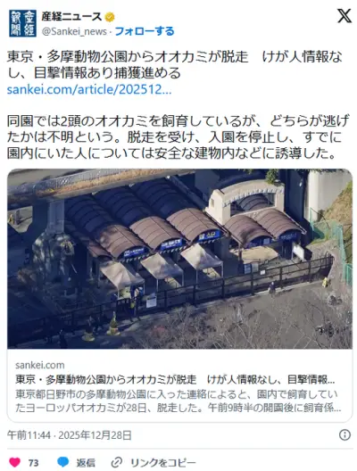 東京・多摩動物公園からオオカミが脱走 けが人情報なし、目撃情報あり捕獲進める
