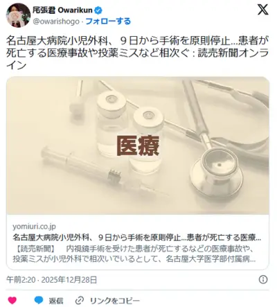 【医療】名古屋大病院小児外科、9日から手術を原則停止…患者が死亡する医療事故や投薬ミスなど相次ぐ