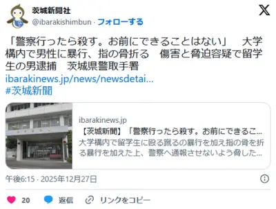 【茨城】「警察行ったら殺す。お前にできることはない」 大学構内で男性に暴行、指の骨折る スリランカ国籍の留学生の男逮捕 取手