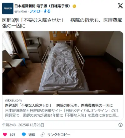 医師3割「不要な入院させた」 病院の指示も、医療費膨張の一因に