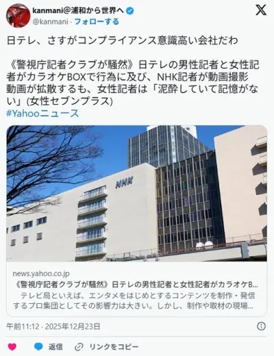 日テレの男性記者と女性記者がカラオケBOXで行為に及び、NHK記者が動画撮影 動画が拡散するも、女性記者は「泥酔していて記憶がない