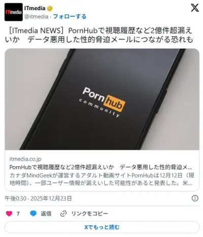 【速報】PornHubで個人情報漏洩 利用者の閲覧履歴2億件が漏洩