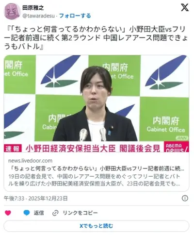 「ちょっと何言ってるかわからない」小野田大臣vsフリー記者前週に続く第2ラウンド 中国レアアース問題できょうもバトル