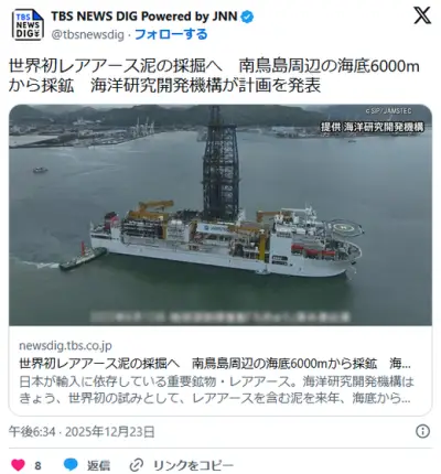 日本、世界初レアアース泥の採掘へ 南鳥島周辺から 現場からはネオジウム等既に確認 成功なら本格採鉱へ