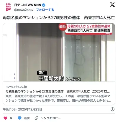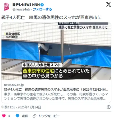 親子4人+間男死亡の殺人事件、間男のスマホが母親の車から発見か