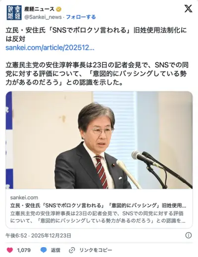 立憲・安住「SNSでボロクソ言われる」「意図的に立憲をバッシングしてる勢力があるのだろう」