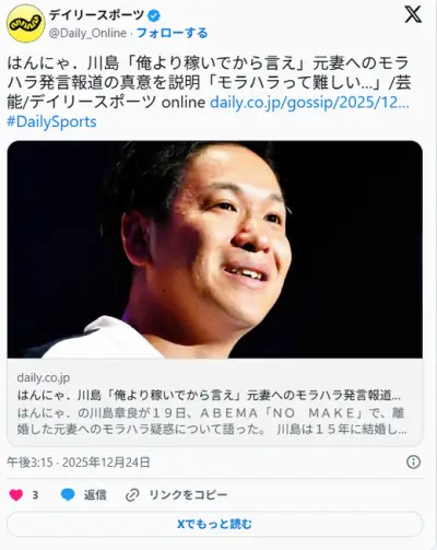 はんにゃ川島「嫁に『俺が仕事辞めて主夫やる。お前は俺より稼げるの?』と言ったらモラハラ夫扱い