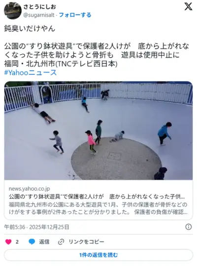 公園の“すり鉢状遊具”で保護者2人けが 底から上がれなくなった子供を助けようと骨折→使用中止
