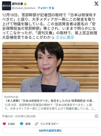 【文春】《本人直撃》「日本は核保有すべき」発言をしたのは“核軍縮担当”の首相補佐官だった! 高市首相が更迭しない理由は…