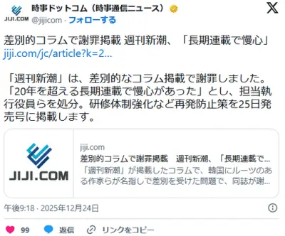 【週刊新潮】差別的コラムで謝罪掲載「長期連載で慢心」
